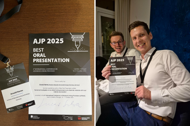 Andererseits, und hierauf ist der Lehrstuhl sehr stolz, wurde Herr A. Harms für den besten Vortrag ausgezeichnet. In seiner Präsentation ging es um das Fügen hybrider Bauteile durch Taumeln.